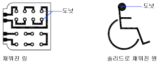 도넛은 채워진 링 또는 솔리드-채움 원으로 사실상 폭을 가진 닫힌 폴리선입니다.