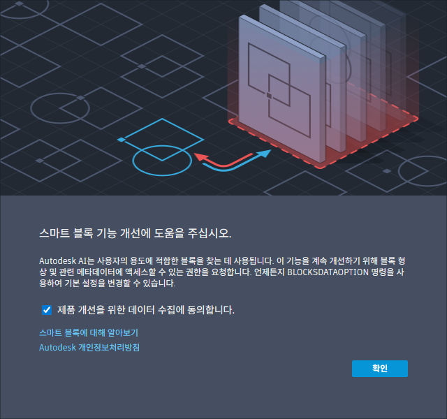 처음으로 스마트 블록 워크플로우를 완료한 후에는 데이터 수집 동의 대화상자가 표시됩니다. 데이터 수집에 동의하면 워크플로우에 사용되는 컨텐츠 데이터가 AutoCAD와 공유됩니다.