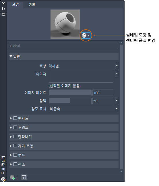 Autodesk 재료 라이브러리에서 제공하는 기존 재료를 편집하거나 일반 재료로 시작합니다. 변경한 내용이 재료 견본 미리보기에 표시됩니다. 미리보기에 표시되는 이미지의 쉐이프를 변경할 수 있습니다.