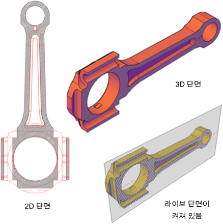 3D 모형의 절단을 게시하거나 렌더링하려면 3D 단면 옵션을 선택합니다. 3D 단면 형상은 대부분 3D 솔리드와 표면으로 구성됩니다. 반면 2D 선은 윤곽선과 해치 패턴으로 이루어집니다.