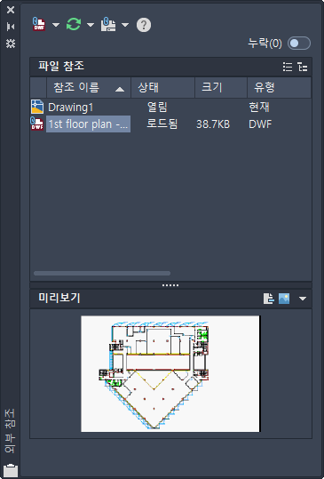 외부 참조 팔레트에서 도면에 부착된 언더레이에 대한 파일별 정보를 볼 수 있습니다. 언더레이를 로드하거나 언로드할 수 있으며 다른 작업을 수행할 수도 있습니다.