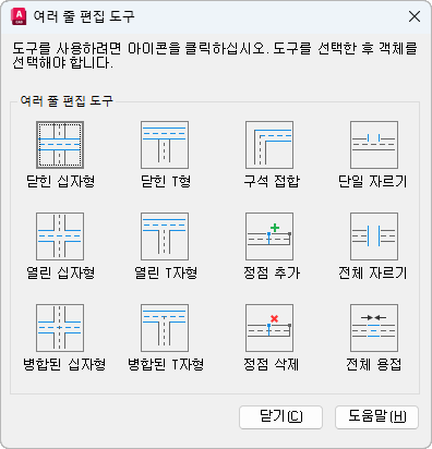 대화상자에는 네 개의 열에 샘플 이미지가 있는 도구가 표시됩니다. 첫 번째 열은 십자형으로 교차하는 여러 줄을 조정하고, 두 번째 열은 T자형을 형성하는 여러 줄을 조정하며, 세 번째 열은 구석 접합과 정점을 조정하고, 네 번째 열은 여러 줄의 끓기점을 조정합니다.
