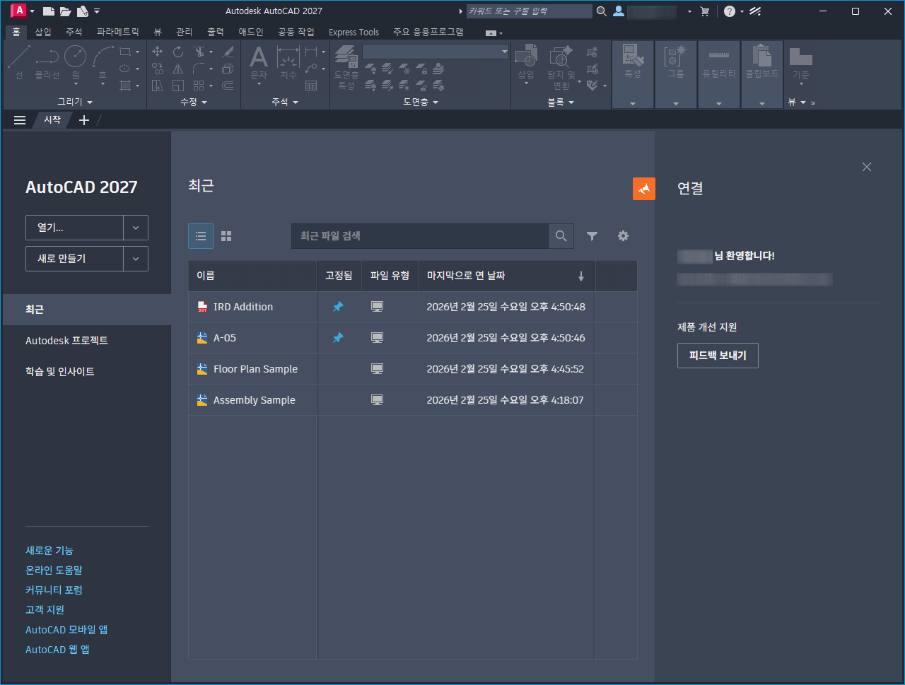 시작 시에 기본적으로 시작 탭이 표시되므로 도면 템플릿 파일, 최근에 연 도면 및 시트 세트, 온라인 및 학습 옵션, 공지를 비롯하여 다양한 초기 작업에 쉽게 액세스할 수 있습니다.