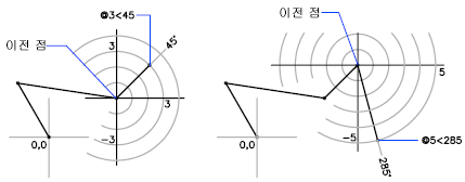 다음 예제에서는 상대 극좌표를 사용하여 그려진 두 선을 보여줍니다. 각 그림에서 선은 '이전 점'이라는 레이블이 붙은 위치에서 시작합니다.