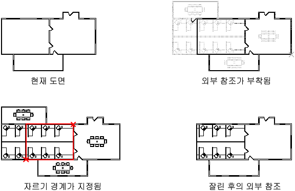 자르기 경계를 지정하여 외부 참조 도면 또는 블록 참조의 일정 부분을 표시할 수 있습니다.