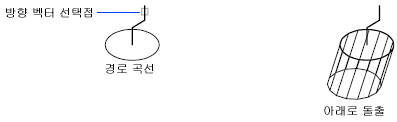 폴리선의 첫 번째 점과 마지막 점만 적용되며 중간 정점은 무시됩니다. 방향 벡터는 돌출될 쉐이프의 방향 및 길이를 나타냅니다. 폴리선 또는 선에서 선택된 끝점이 돌출 방향을 결정합니다. 원래 경로 곡선은 방향 벡터가 방향 벡터 메쉬의 구성을 지시하는 방법을 쉽게 시각화하기 위해 폭을 가진 선으로 그려집니다.