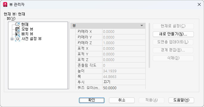 새 뷰/샷 특성 대화상자 또는 새 뷰 대화상자를 표시합니다.