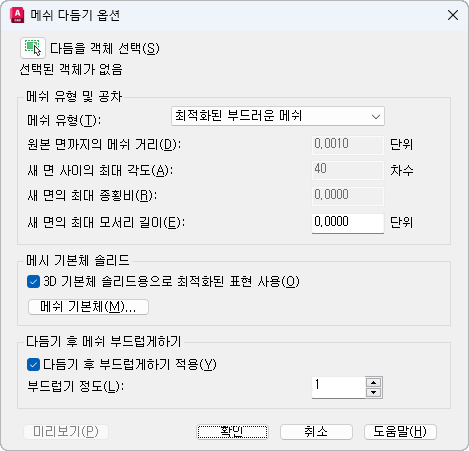 메쉬 다듬기 옵션 대화상자에서 기본값을 설정하여 3D 메쉬 객체로 변환할 객체의 모양을 조정할 수 있습니다. 메쉬로 변환 가능한 객체의 전체 리스트는 MESHSMOOTH 명령을 참고하십시오.