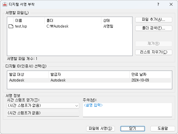 이 대화상자에 나열된 모든 파일에 디지털 서명을 부착합니다.