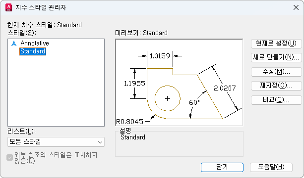 현재 치수 스타일의 이름을 표시합니다. 기본 치수 스타일은 STANDARD입니다. 작성한 치수에 현재 스타일이 적용됩니다.