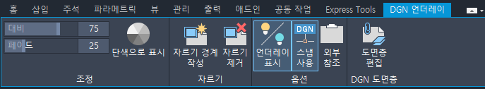 도면에서 DGN 언더레이를 선택하면 DGN 언더레이 상황별 탭이 리본에 표시됩니다.