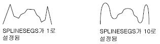 SPLINESEGS 시스템 변수를 사용하여 대략적인 스플라인의 정교함이나 거칠음을 조사하거나 변경할 수 있습니다. 기본값은 8입니다. 이 값을 더 높게 설정하면 더 많은 세그먼트 선이 그려지고 이상적인 스플라인에 비해 대략적인 스플라인이 보다 정교하게 됩니다. 생성된 스플라인은 도면 파일에서 더 많은 공간을 차지하고 생성하는 데 더 오래 걸립니다.