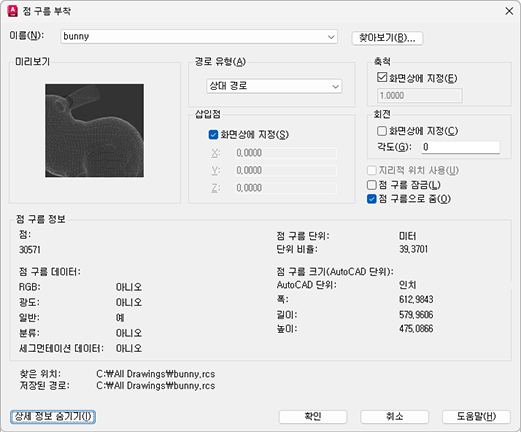 - 점 구름 부착 대화상자에서 삽입점, 축척 및 회전에 대한 기본 설정을 지정합니다.