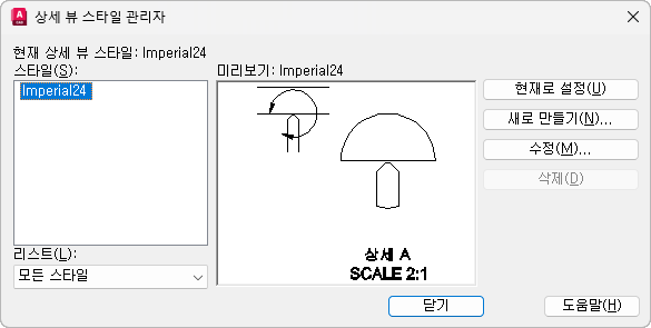 현재 도면 파일에서 사용할 수 있는 상세도 스타일 리스트를 표시합니다. 현재 스타일은 강조됩니다.
