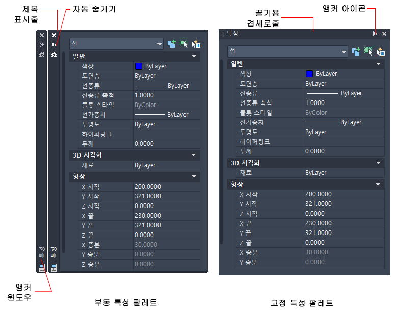 리본, 특성 팔레트, 도구 팔레트, 명령 윈도우 및 DesignCenter 등의 윈도우를 고정, 앵커 또는 부동 상태로 만들 수 있습니다. 이 기능과 다른 옵션의 설정은 팔레트 또는 윈도우의 제목 표시줄을 마우스 오른쪽 버튼으로 클릭하여 사용할 수 있는 바로 가기 메뉴에서 변경할 수 있습니다.
