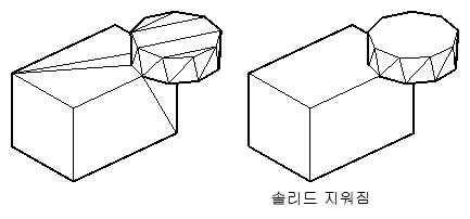 동일한 표면 또는 정점 정의를 공유하는 중복된 모서리나 정점을 제거할 수 있습니다. 이 작업은 인접한 면을 병합하고 중복된 모서리와 미사용 모서리를 모두 삭제합니다.
