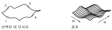 다음 그림의 메쉬는 모서리라는 4개의 객체에서 파생된 것입니다. 모서리는 닫힌 루프를 형성하며 끝점을 공유하는 호, 선, 폴리선, 스플라인 또는 타원형 호가 될 수 있습니다. Coon 패치는 네 개의 모서리 사이에 삽입된 이중 입방체 표면(한 곡선은 M 방향이고 다른 한 곡선은 N 방향)입니다.