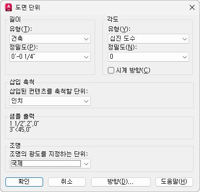현재 각도 형식과 현재 각도 표시의 정밀도를 지정합니다.