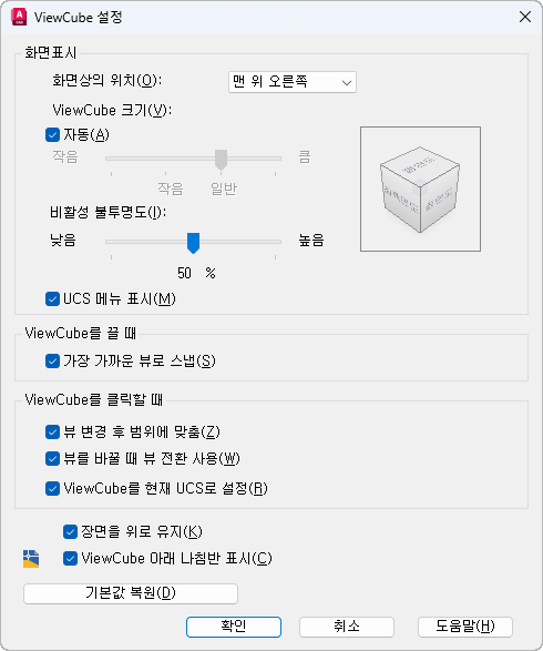 현재 설정을 기준으로 ViewCube의 실시간 미리보기를 표시합니다.