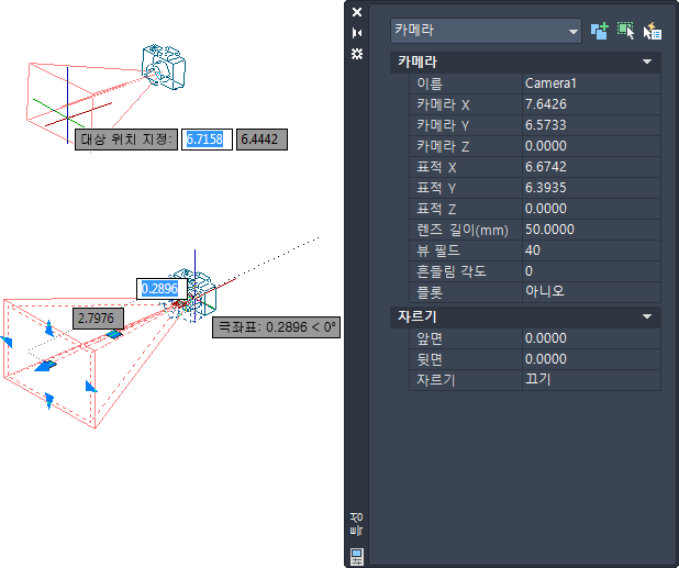 카메라의 렌즈 길이를 수정하고 앞면 및 뒷면 자르기 평면을 변경하며 카메라 이름을 지정하고 도면에서 모든 카메라의 표시를 켜거나 끌 수 있습니다.