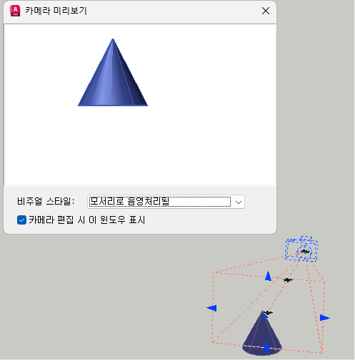 카메라를 선택하면 카메라 미리보기 대화상자가 열리며 카메라의 뷰가 표시됩니다.