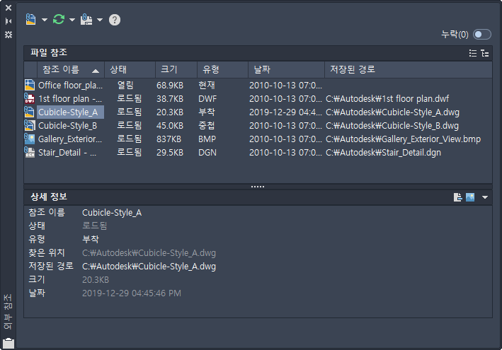 참조 이름 열에는 항상 현재 도면이 첫 번째 항목으로 표시되며 그 뒤에는 부착된 순서대로 나열되는 추가 부착 파일이 표시됩니다.