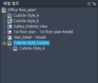 트리 뷰의 맨 위 단계에는 항상 현재 도면이 표시됩니다. 참조된 파일은 다음 단계에 표시됩니다. 자체적으로 내포된 파일 참조를 포함하는 참조된 파일을 열어 해당 하위 단계를 표시할 수 있습니다. 트리 뷰에서 선택할 때는 한 번에 하나의 파일 참조만 선택할 수 있습니다.