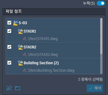 이 옵션은 현재 도면에 누락된 참조가 없을 때 표시됩니다. 클릭하면 부착된 모든 참조 표시 상태가 활성화되고 현재 도면에 부착된 모든 참조를 볼 수 있습니다.