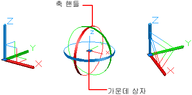 기본적으로 장치는 최초에 선택 세트의 중심에 배치됩니다. 하지만 사용자가 이를 3D 공간 내 임의의 위치로 재배치할 수 있습니다. 장치의 가운데 상자(또는 기준 그립)는 수정을 위한 기준점을 설정합니다. 이 동작은 선택한 객체를 이동하거나 회전하는 동안 UCS의 위치가 임시로 바뀌는 것과 같습니다. 장치에 있는 축 핸들이 이동이나 회전을 축이나 평면으로만 제한합니다.