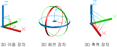 장치는 숨김과 같은 3D 비주얼 스타일을 사용하도록 설정된 3D 뷰에서만 사용할 수 있습니다. 3D 객체 또는 하위 객체 선택 시 자동으로 표시되도록 장치를 설정할 수 있습니다. 3D 이동, 3D 회전 및 3D 축척 작업 중에도 장치가 표시됩니다.