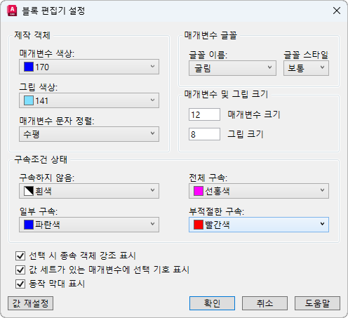 블록 편집기에 대해 색상, 문자, 그립, 구속조건 및 기타 표시 설정을 수정합니다.