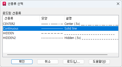 선택된 선종류를 도면에 로드하고 선종류 리스트에 추가할 수 있는 선종류 로드 또는 다시 로드 대화상자를 표시합니다.