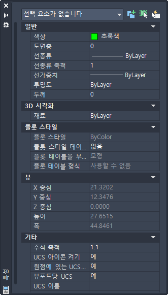 - 선택한 객체가 없는 경우 모든 새 객체에 사용할 현재 특성을 보고 변경할 수 있습니다.