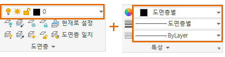 리본의 홈 탭에서 도면층 및 특성 패널을 사용하여 도면층, 색상, 선가중치 및 선종류와 같이 자주 액세스하는 특성에 대한 설정을 확인하거나 변경할 수 있습니다.