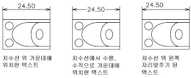 문자 정렬 같은 기타 설정은 문자의 수직 정렬에 영향을 줍니다. 예를 들어, 위에서 맨 왼쪽 그림에서와 같이 수평 정렬을 선택하면 치수보조선 내부의 문자와 치수 선 내부의 중심에 배치된 문자가 수평으로 정렬됩니다. 치수 선이 수평이 아니라도 문자는 수평으로 정렬됩니다.