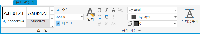 주: MTEXTTOOLBAR 시스템 변수는 문자 형식 도구막대의 화면표시를 조정합니다.