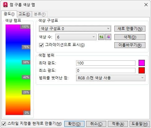 광도 점 구름 스타일 지정에 대한 색상 구성표 설정을 편집합니다.