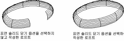 표면 또는 솔리드를 닫거나 엽니다. 이 옵션을 사용하면 횡단은 토러스 모양 패턴을 형성하여 로프트 표면 또는 솔리드가 닫힌 튜브를 형성할 수 있습니다. (LOFTPARAM 시스템 변수)