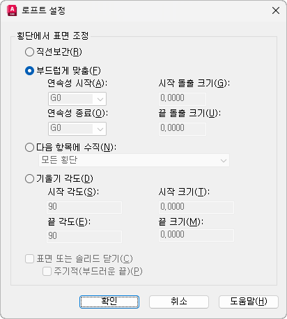 횡단면을 통해 통과하는 솔리드 또는 표면의 곡면 법선을 조정합니다. (LOFTNORMALS 시스템 변수)