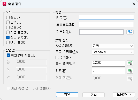 속성의 위치를 지정합니다. 좌표 값을 입력하거나, 화면상에 지정을 선택하고 좌표 입력 장치를 사용하여 다른 객체를 기준으로 속성의 위치를 지정합니다.