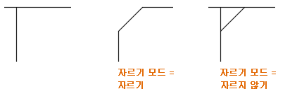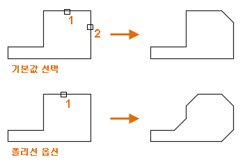 기본적으로 모따기 또는 베벨을 정의하기 위해 선택한 객체는 결과 각진 선으로 잘리거나 연장됩니다. 자르기 옵션을 사용하면 선택한 객체가 변경되는지 아니면 변경되지 않고 유지되는지를 지정할 수 있습니다.