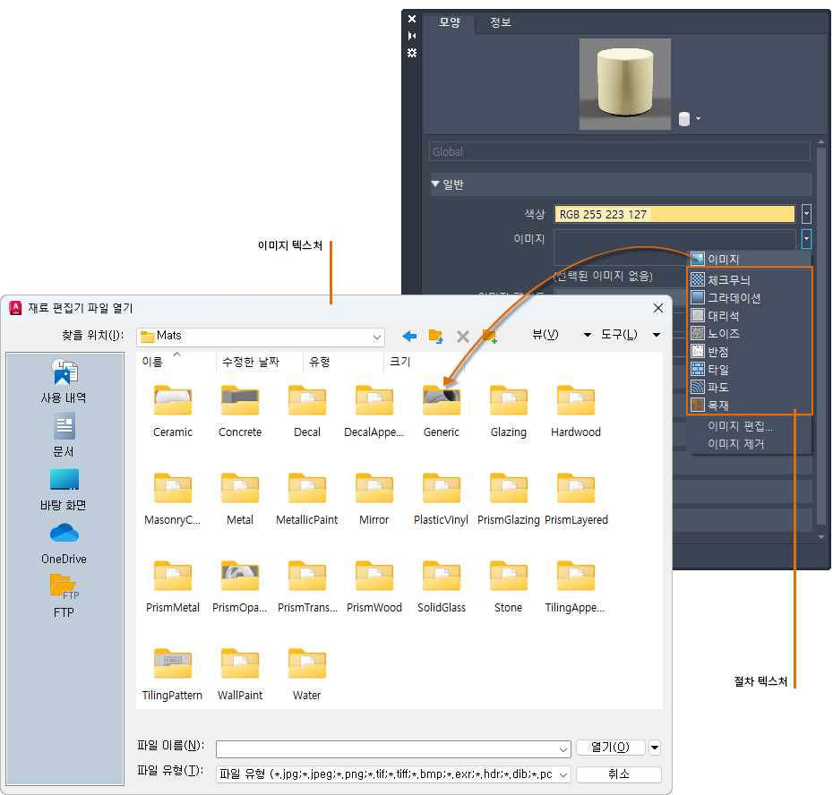 이 제품은 텍스처에 사용할 수 있는 이미지 라이브러리를 제공합니다. 또한 다음 파일 유형을 사용하여 자신만의 텍스처를 추가할 수도 있습니다.