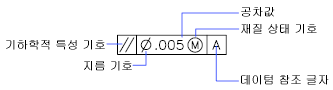 기호가 기하학적 공차 대화상자의 기호 문자 상자에 삽입됩니다. 다음 표에 기호가 설명되어 있습니다.
