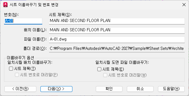 이 옵션이 선택되면 시트 제목과 일치하도록 도면 파일 이름을 변경합니다.