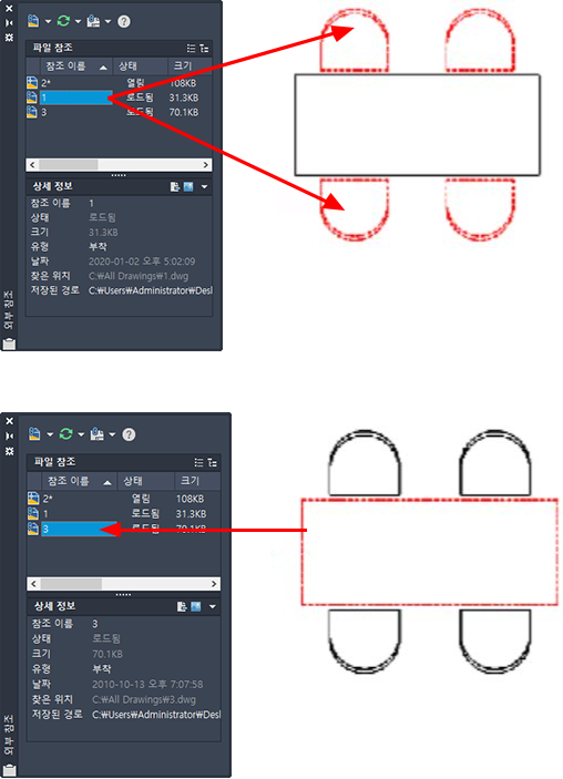 부착된 외부 참조는 지정된 도면 파일의 모형 공간에 대한 링크입니다. 도면을 열거나 외부 참조를 다시 로드하면 참조된 도면의 변경 사항이 현재 도면에 자동으로 반영됩니다. 외부 참조를 부착해도 현재 도면의 크기가 크게 증가되지는 않습니다.