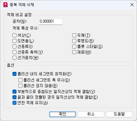 이 설정을 사용하여 OVERKILL에서 선, 호 및 폴리선을 처리하는 방법을 조정합니다.