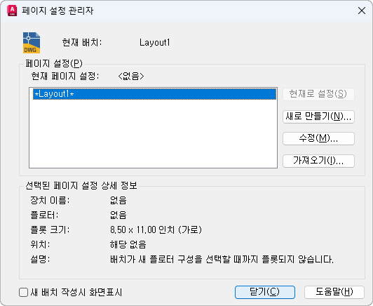 현재 페이지 설정을 표시하고, 다른 페이지 설정을 현재로 설정하며, 새 페이지 설정을 작성하고, 기존 페이지 설정을 수정하고, 다른 도면에서 페이지 설정을 가져옵니다.