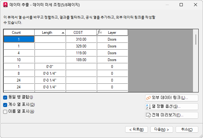 테이블 모양에 만족하면 도면에 테이블을 삽입할 때 추출이 완료됩니다. 프로젝트 공동작업자와 추출한 정보를 공유해야 할 경우 동일한 추출 데이터를 외부 파일로 출력할 수 있습니다.