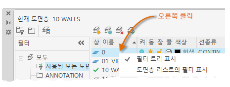 도면층 리스트 맨 위에 도면층 필터를 표시합니다. 이 옵션을 선택 해제하면 도면층 리스트에 도면층만 표시됩니다.