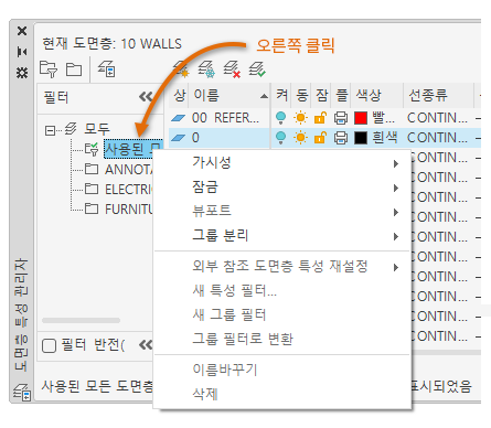 선택한 도면층 필터를 제거합니다. 모든 도면층, 사용된 모든 도면층 또는 외부 참조 도면층 필터는 삭제할 수 없습니다.